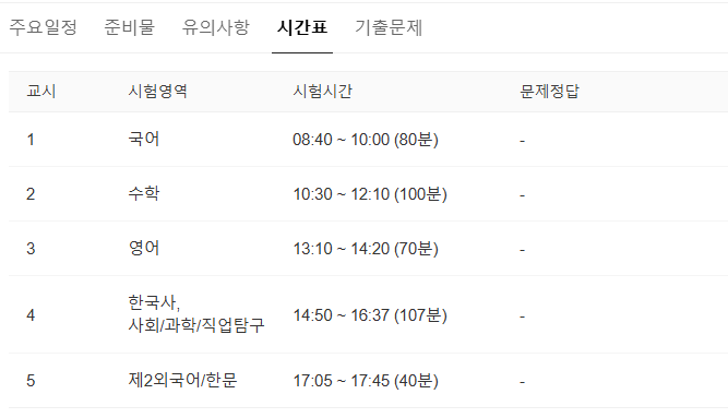2026 대학수학능력시험 시간표