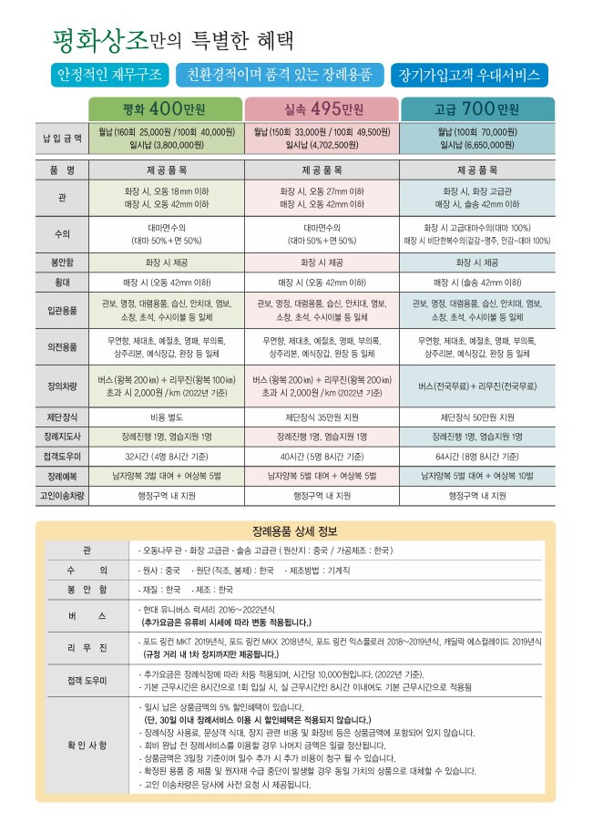 평화상조 상품은 아래와 같이 3종류가 있으며 저희 부모님의 경우 실속상품으로 가입하여 납입중이셨습니다. 실속상품으로 진행시 크게 아쉬운점은 없었으며, 아버지 체구로 인해 맞춤관을 사용한 것 외에 추가비용은 없었습니다.