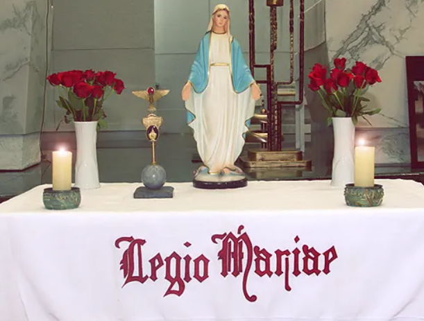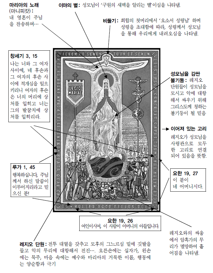 로마 군대 제도를 본딴 이 단체는 1921년 아일랜드 더블린에서 조직되었으며, 빈첸시오 아 바오로회에서 교구 빈민원의 환자를 방문하려는 계획을 작성하기 위해 모임을 갖게 된 데서 비롯되었다. 단원은 마리아의 깊은 겸손과 완전한 순명, 그리고 천사적 친절과 끊임없는 기도, 또한 하자 없으신 정결과 고행 등의 정신으로 활동하며, 본당 신부의 사목 방침과 지도에 따라 봉사하고 선교 활동을 한다.