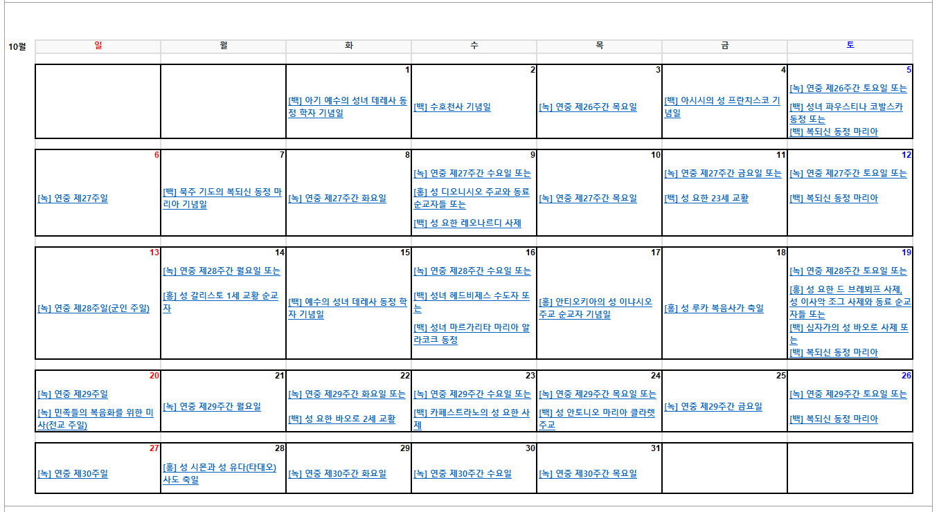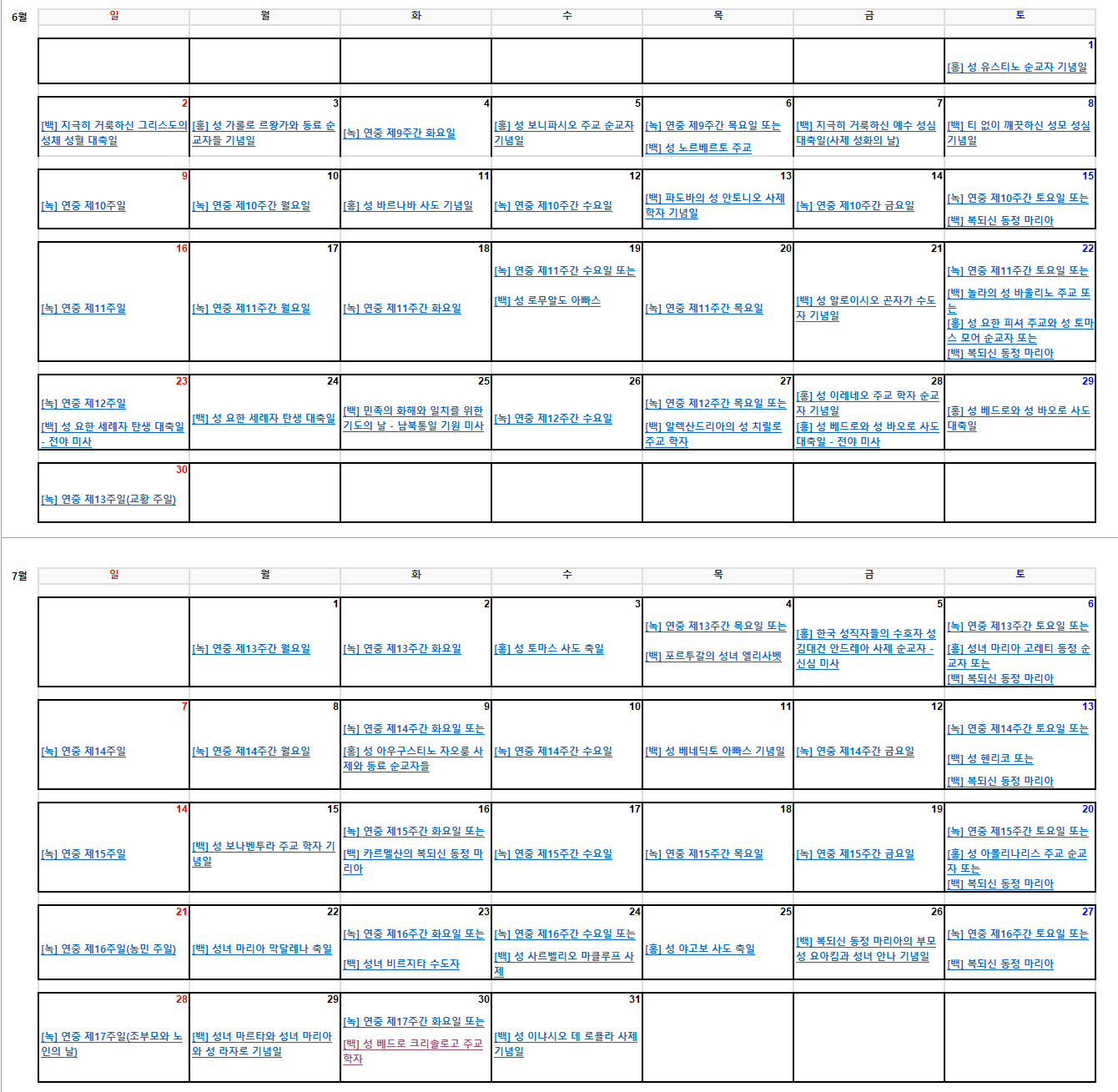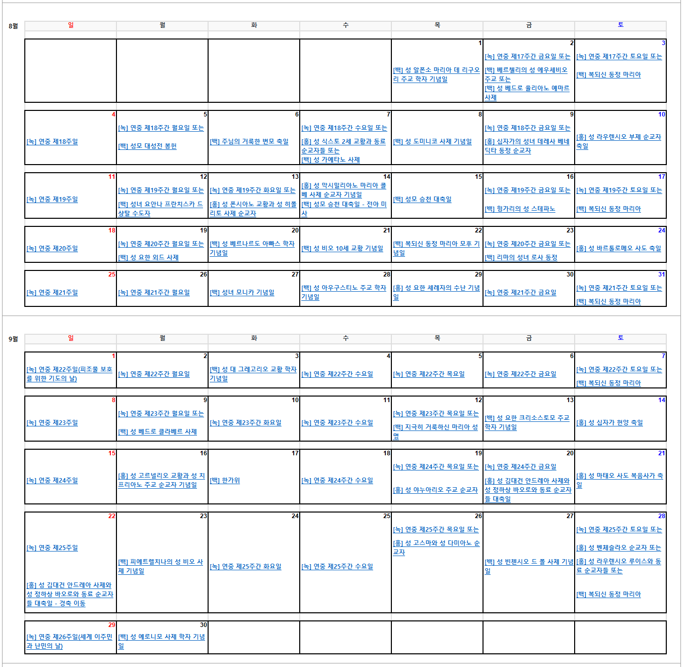 목차 [ 2025 가톨릭 전례력 다운로드] ▶ 2025년 전체 가톨릭 전례력 엑셀 파일 다운로드 및 예시 : 다운로드 받은 파일의 날짜별 하이퍼링크 클릭 하시면 해당 독서, 복음으로 이동