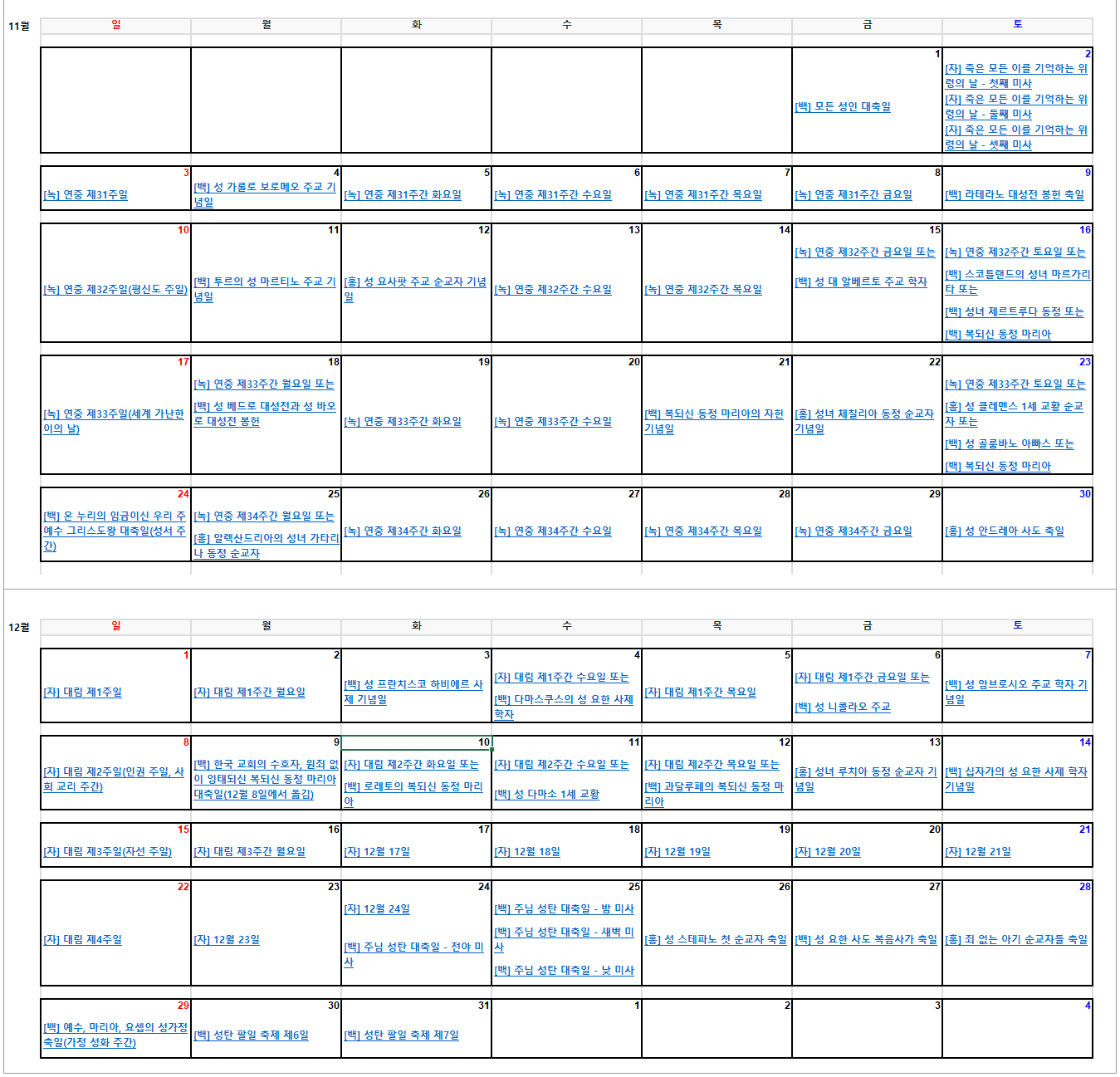 목차 [ 2025 가톨릭 전례력 다운로드] ▶ 2025년 전체 가톨릭 전례력 엑셀 파일 다운로드 및 예시 : 다운로드 받은 파일의 날짜별 하이퍼링크 클릭 하시면 해당 독서, 복음으로 이동